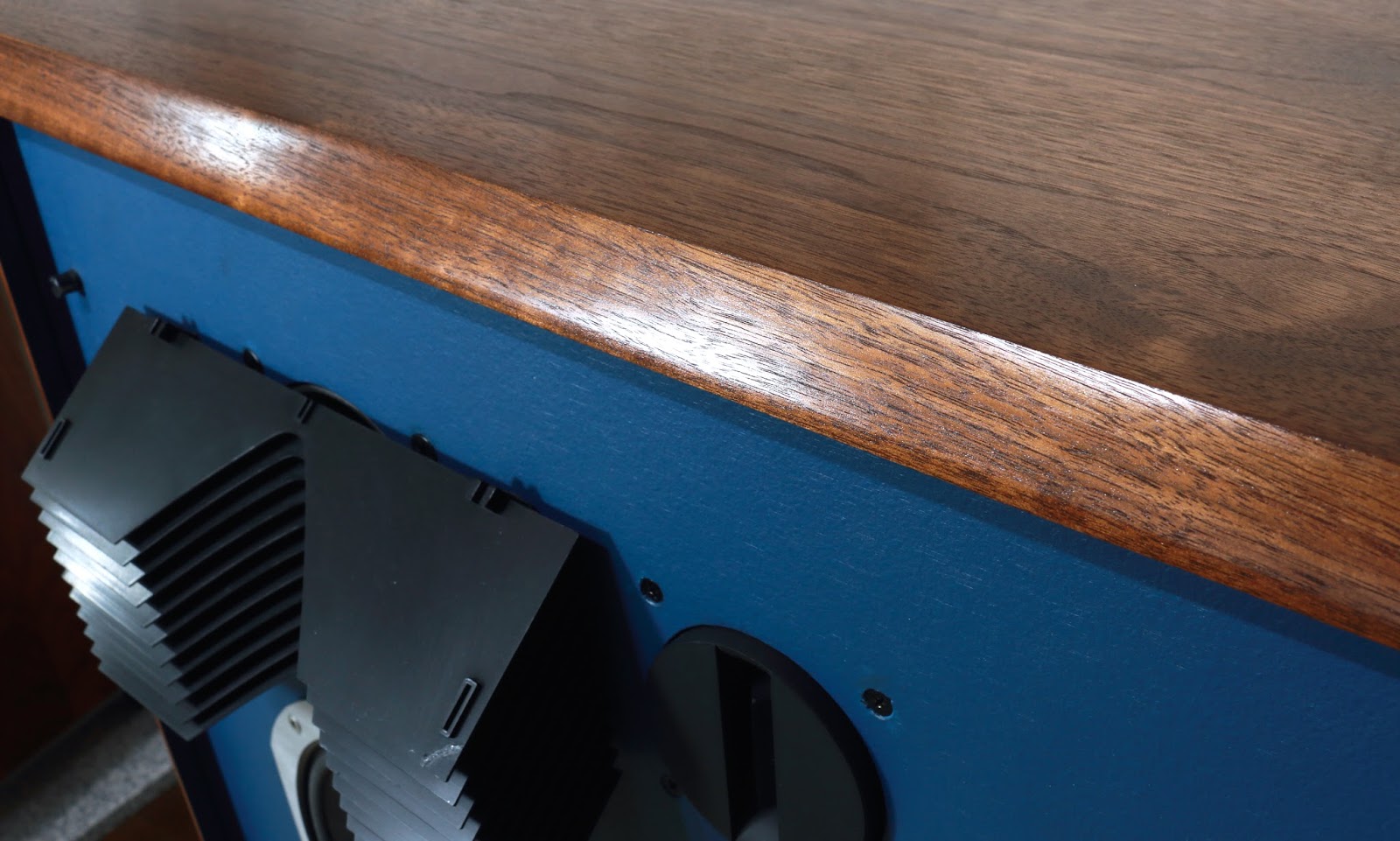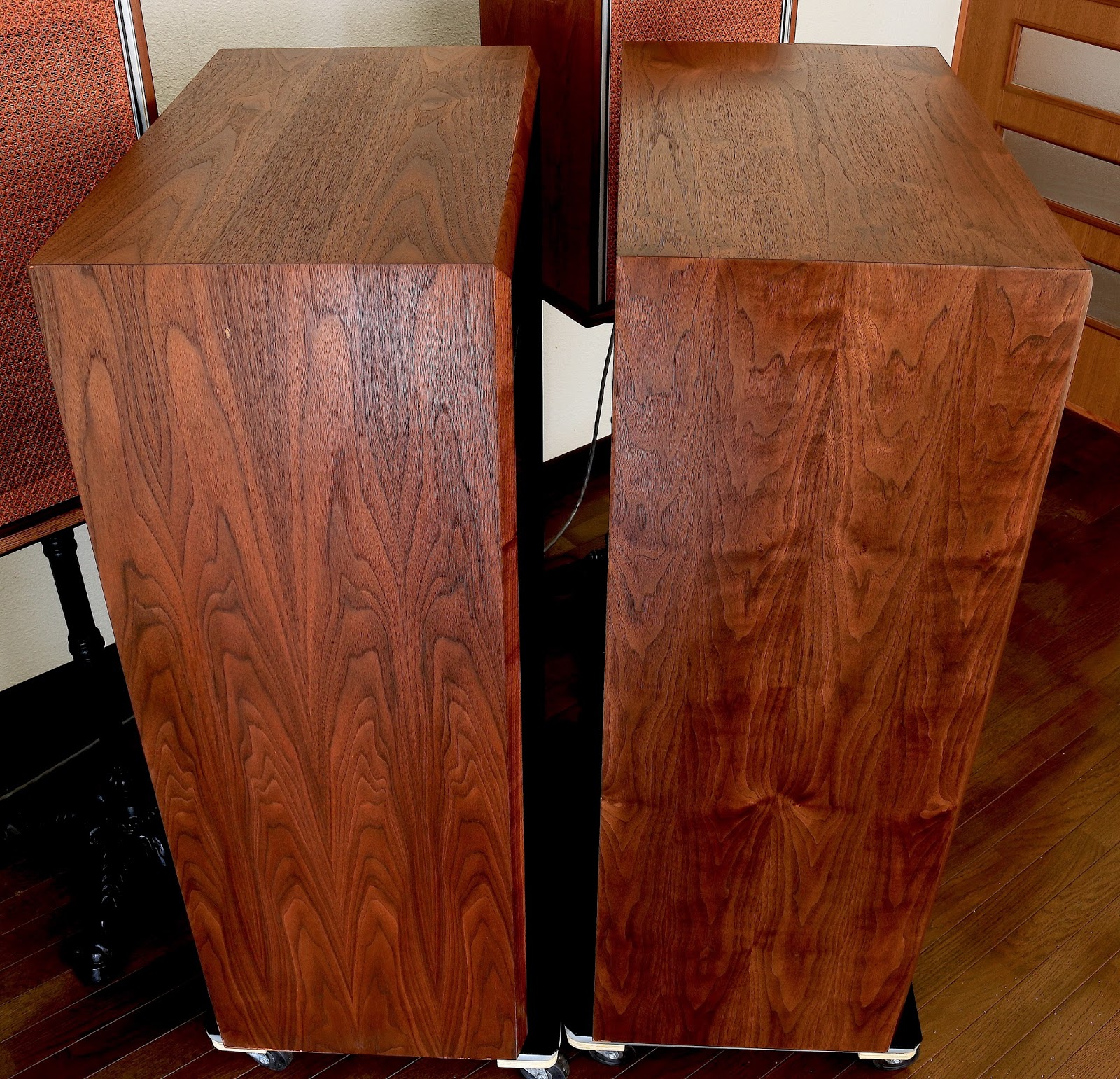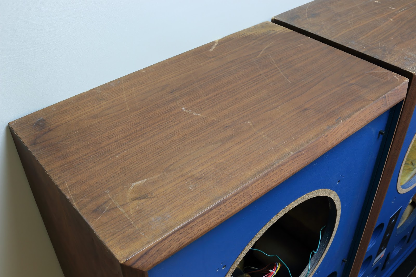私は今までに数多くのJBLヴィンテージスピーカーを手掛けてきました。43シリーズや民生用のLシリーズ、更に古いハーツフィールドやハークネスやパラゴンと数え切れません。その中で必須項目であるのがJBLスピーカーキャビネット新品仕上げ。この年代のJBLスピーカーは合板やパーチクルボードでスピーカーキャビネットを組み天然木のウォールナットやオークの突き板仕上げになっているのだ。長い年月が経過し表面には傷や打痕やシミが刻まれ、角欠けや深い傷だらけである。